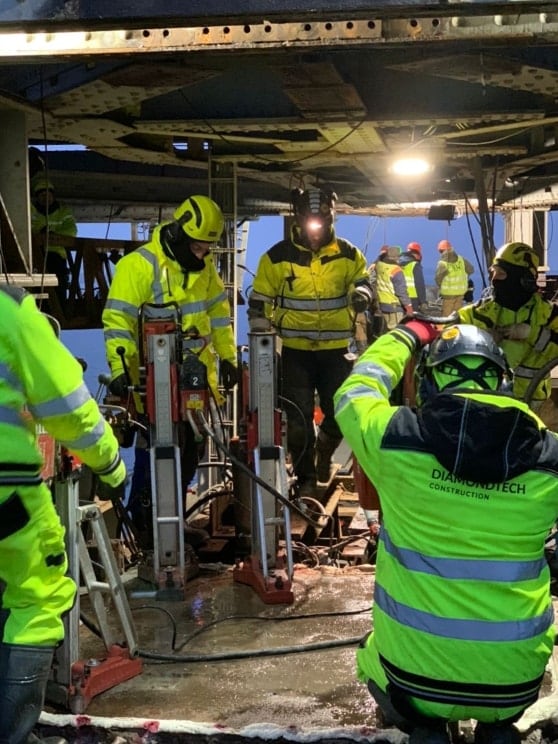 В условиях где на площади 4м² параллельно работает 6 установок алмазного сверления, выбиваются керны, убирается пылесосом шлам, параллельно идет монтаж металлоконструкций и вклейка анкеров, а на работу отведено всего 2 часа и те в ночное время, принцип «минимум персонала – максимум технологий» играет ключевую роль в успехе проекта. На объекте должны быть только специалисты!