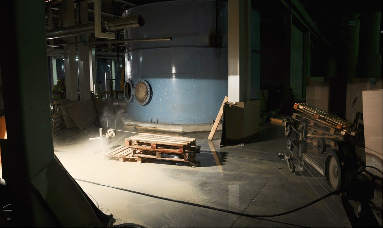 Заказчику было необходимо развернуть технологическую ёмкость на 180°, а нам в свою очередь для этого требовалось произвести канатную резку восьмигранного фундамента по площади 30м² и сделать это идеально ровно, так как в противном случае установить ёмкость строго вертикально в новое положение было бы невозможно.