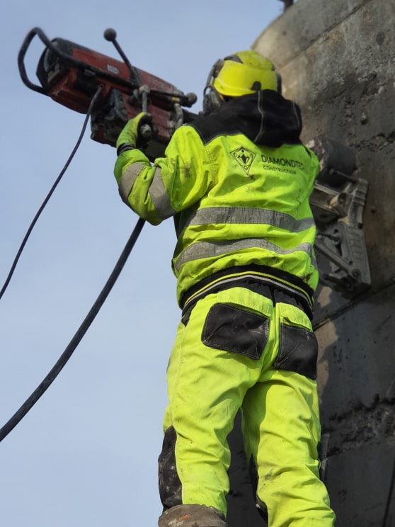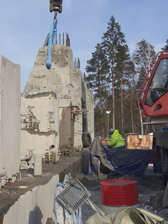 Основным преимуществом канатной резки можно считать минимальное количество персонала задействованного в работе. От нас на объекте находились два специалиста. Один отвечал за резку опор, второй за бурение отверстий под стропы крана. Третим специалистом можно считать оператора крана, предоставленного заказчиком.