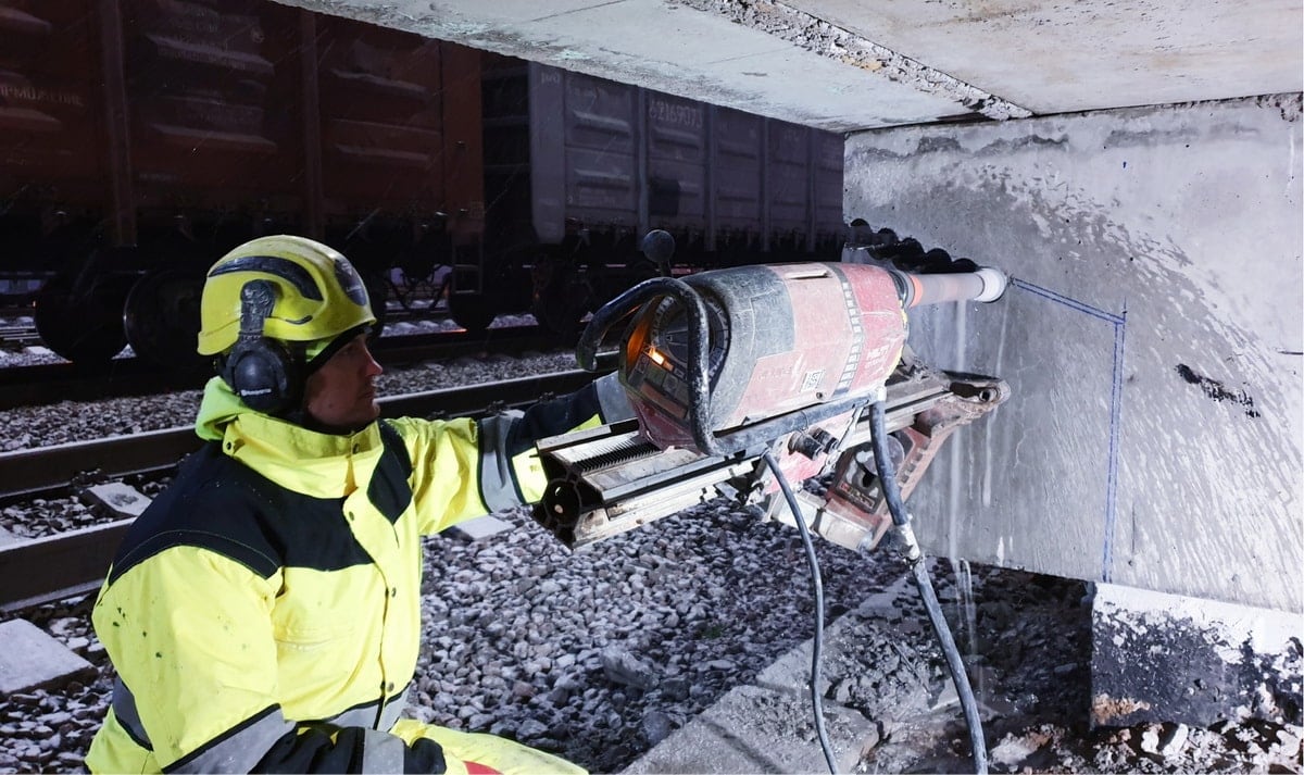 В свою очередь алмазное бурение отверстий здесь оказалась наиболее приемлемым методом: мы использовали сразу 3 установки HILTI DD350 без необходимости подключения к 380В, количество персонала на 1 единицу оборудования — 1 человек, на объекте всегда находилась запасная установка и бензиновый генератор, исключающие форс-мажор, а наладка оборудования занимала минуты.