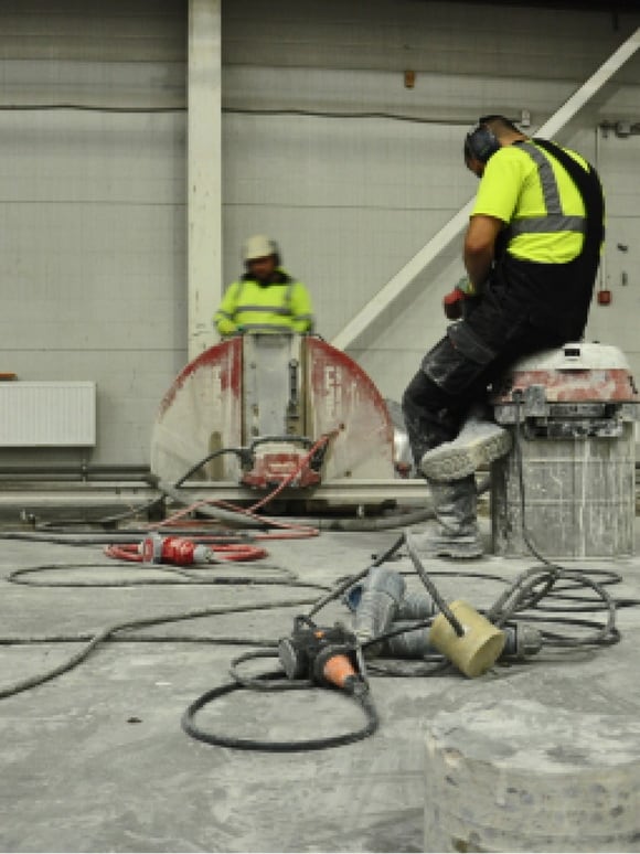 Затем приступаем к алмазной резке бетона на транспортабельные фрагменты весом до 1 тонны. Используем дисковые стенорезные системы HILTI и мощные промышленные пылесосы для уборки воды и шлама на всех этапах работ.