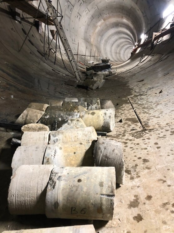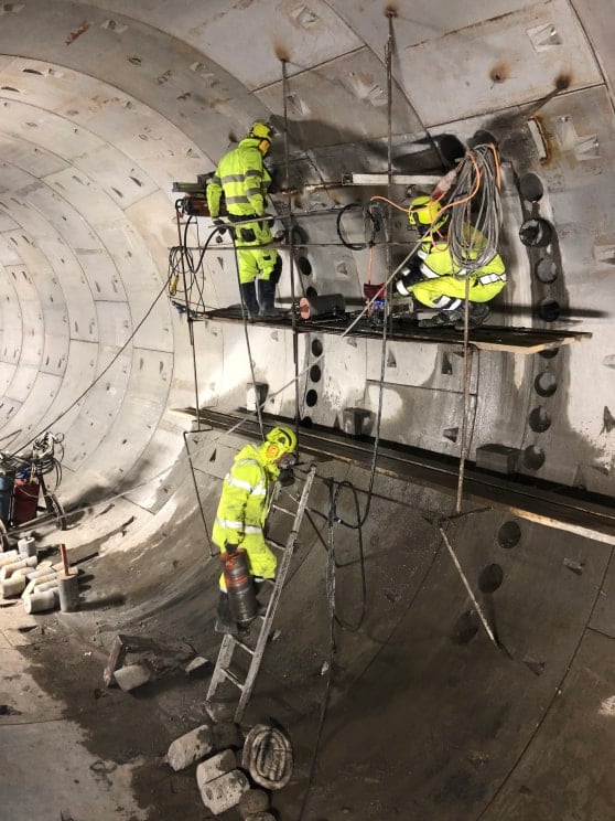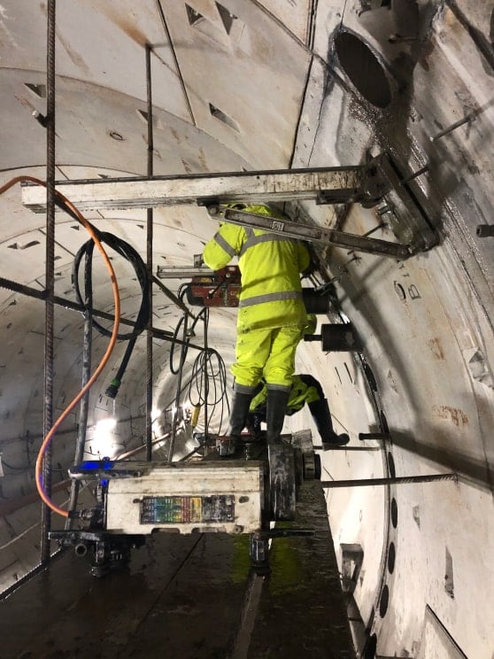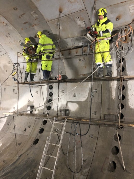 Для этих работ по периметру проемов в обоих тоннелях специалистами «ДАЙМОНДТЕК КОНСТРАКШН» было просверлено 80 отверстий Ф200мм. в высокоточных железобетонных блоках сборной обделки метрополитена.
